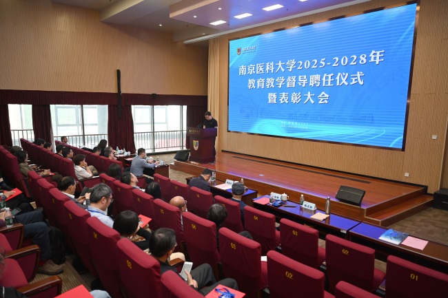 本届督导组由66位专家组成,包含20名专职督导和46名兼职督导,是学校首届本科、研究生、国际教育、继续教育“四教联动”一体管理的督导队伍。大会上,冯锋副校长宣读了《关于表彰南京医科大学2023-2025年优秀教学督导的决定》和《关于聘请周建伟等同志任南京医科大学2025—2028年教育教学督导的决定》;胡志斌校长、冯锋副校长先后为优秀教学督导颁发荣誉证书、新聘督导代表颁发聘书;优秀督导代表胡琴教授、林兴建教授分享督导工作心得体会,督导组组长周建伟教授代表新聘督导专家发言。