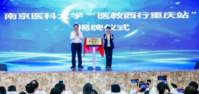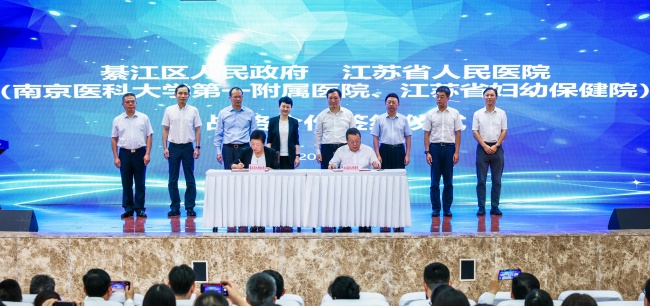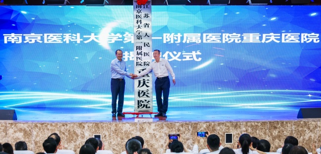 7月4日下午,“医教西行——重庆站”启动仪式在江苏省人民医院重庆医院规培基地召开。会上,作为本次“医教西行——重庆站”专项行动的重要环节,南京医科大学第一附属医院(江苏省人民医院、江苏省妇幼保健院)与綦江区人民政府签署战略合作协议。根据协议,双方将在科研项目培育及申报、住院医师规范化培训体系共建等方面开展深入合作。南京医科大学党委书记兰青,党委副书记、一附院党委书记丁强,綦江区委副书记、区长郭小萍见证签约,重庆市医保局副局长古洋,綦江区领导蔡鹏、陈贤参加。现场还举行了南京医科大学第一附属医院重庆医院揭牌仪式。