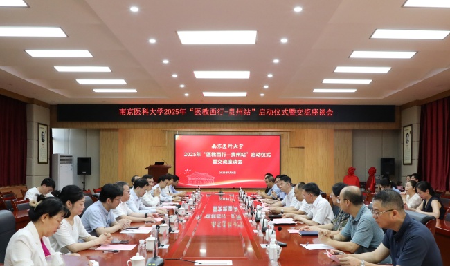 7月6日,南京医科大学2025年“医教西行——贵州站”专项行动启动仪式暨交流座谈会在遵义医科大学附属医院举行。遵义医科大学党委书记刘文、贵州省卫生健康委交流合作处二级调研员曾茜、遵医附院院长余昌胤、副院长魏在荣等参会。