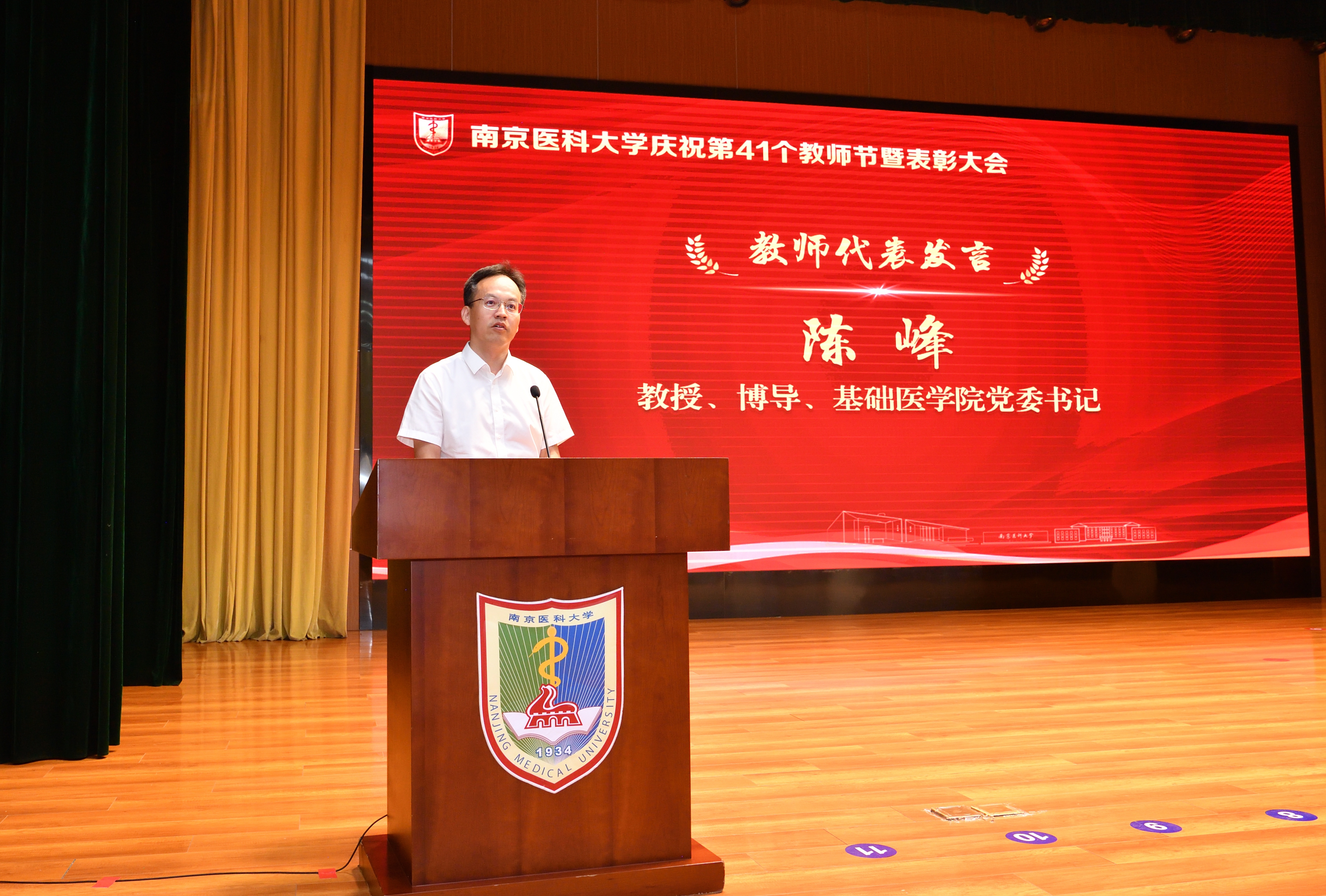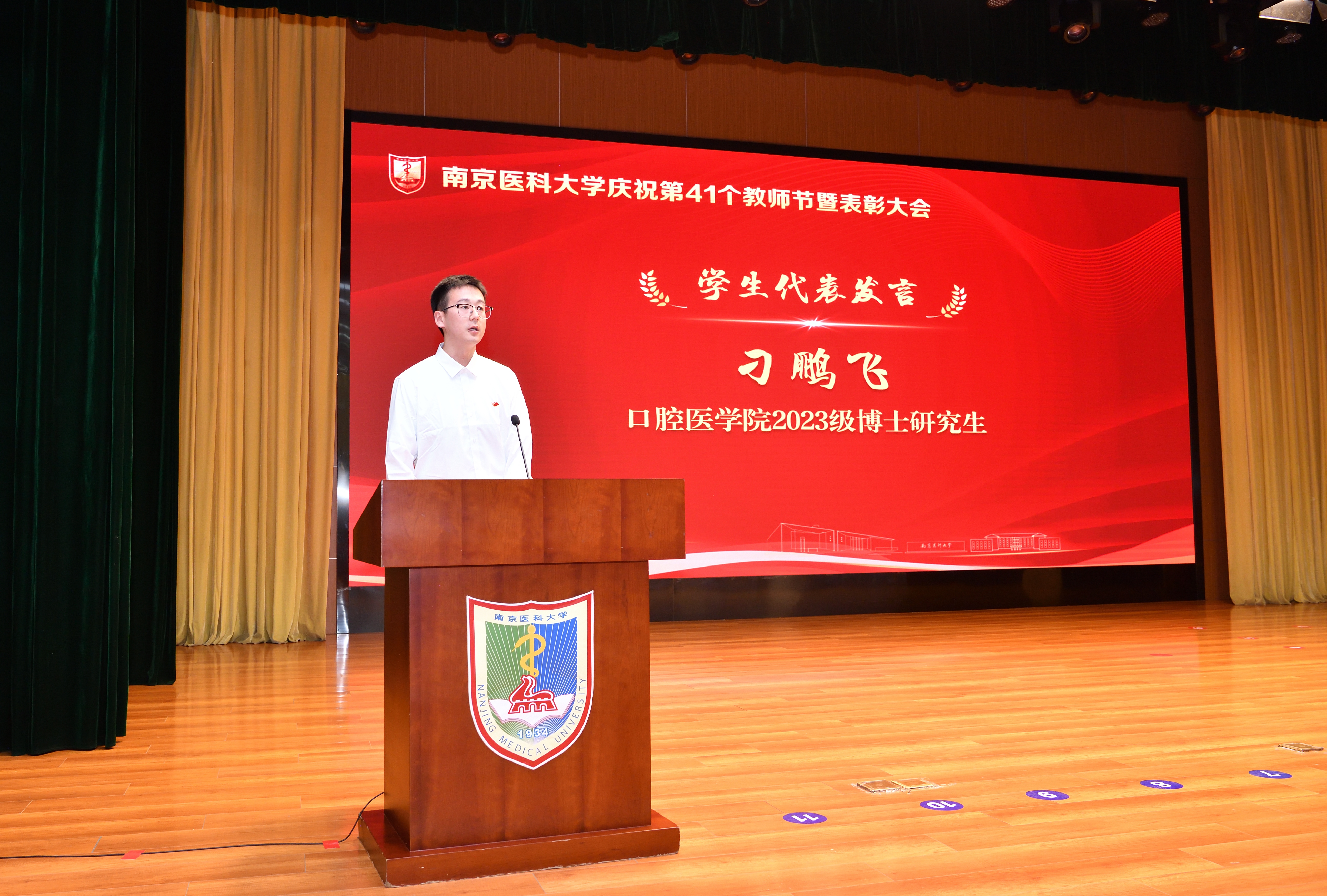 在“启程篇”中,口腔医学院2023级博士研究生刁鹏飞作为学生代表发言,他代表全校同学向老师们表达感谢与敬意,并送上节日的祝福。国家杰出青年基金获得者、基础医学院陈峰教授作为教师代表发言,他深情回顾了个人与南医大共同成长的故事,并号召广大教师始终心怀“国之大者”、恪守“师者本色”、坚持“四个面向”,以“长风破浪会有时”的信念、“板凳要坐十年冷”的定力和“砥砺深耕以致远”的行动,做立德树人的坚守者、教育初心的践行者、科研创新的攀登者,为学校高质量发展和教育强国建设贡献更大的力量!