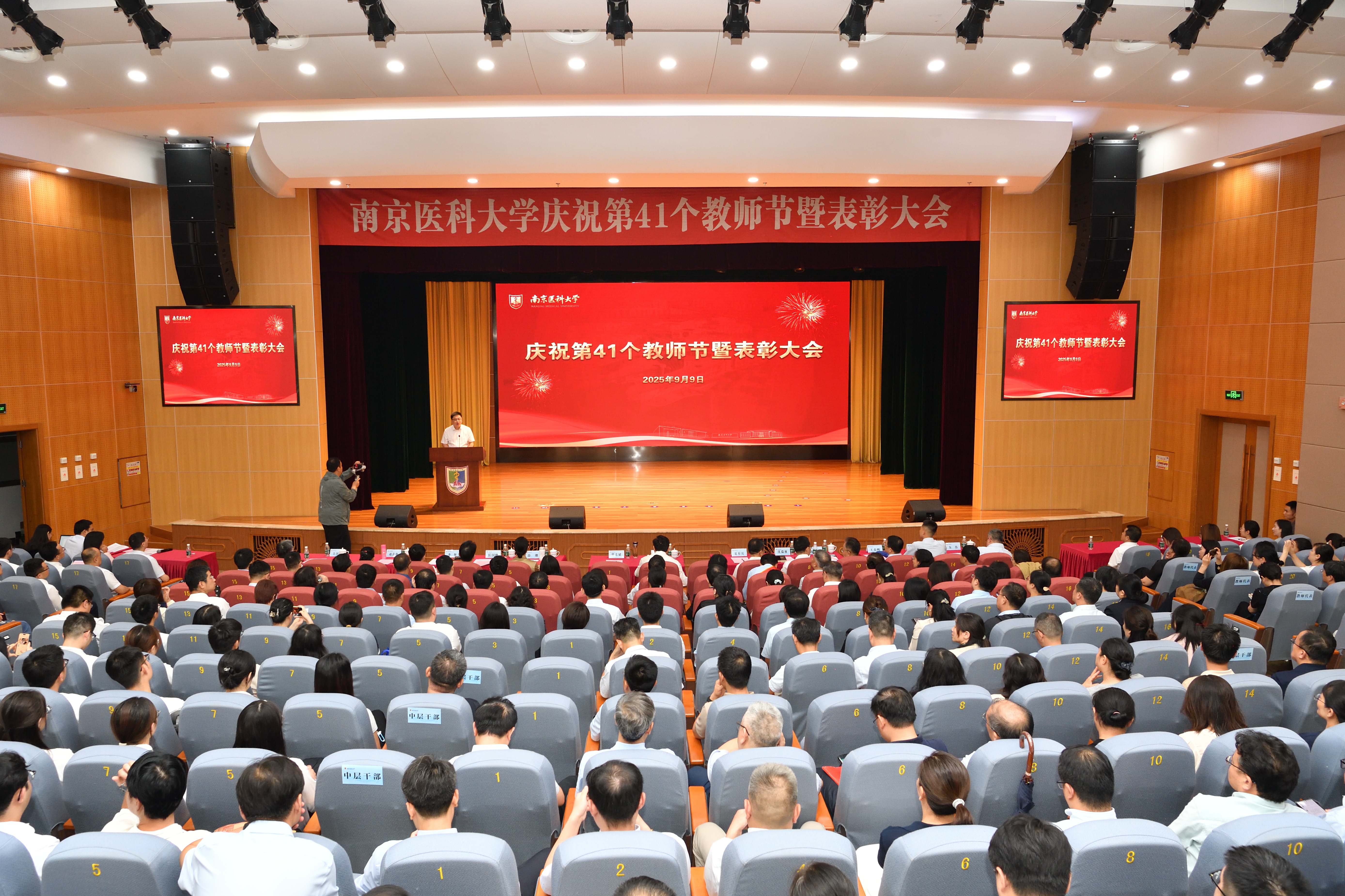 9月9日下午,我校庆祝第41个教师节暨表彰大会在江宁校区大学生活动中心举行。校领导兰青、胡志斌、夏有兵、徐珊、沈瑞林、岳国峰、沈历宗、李坚,党委常委、党委宣传部部长王春晖,以及相关奖教金设立单位负责人出席会议。全体中层干部、受表彰人员、荣休教师代表、新聘任教授、全体新教职工、教师代表、学生代表、辅导员代表400余人参加大会。大会共分四个篇章,“致敬篇”“奋进篇”由校长胡志斌主持,“传承篇”“启程篇”由副校长沈历宗主持。