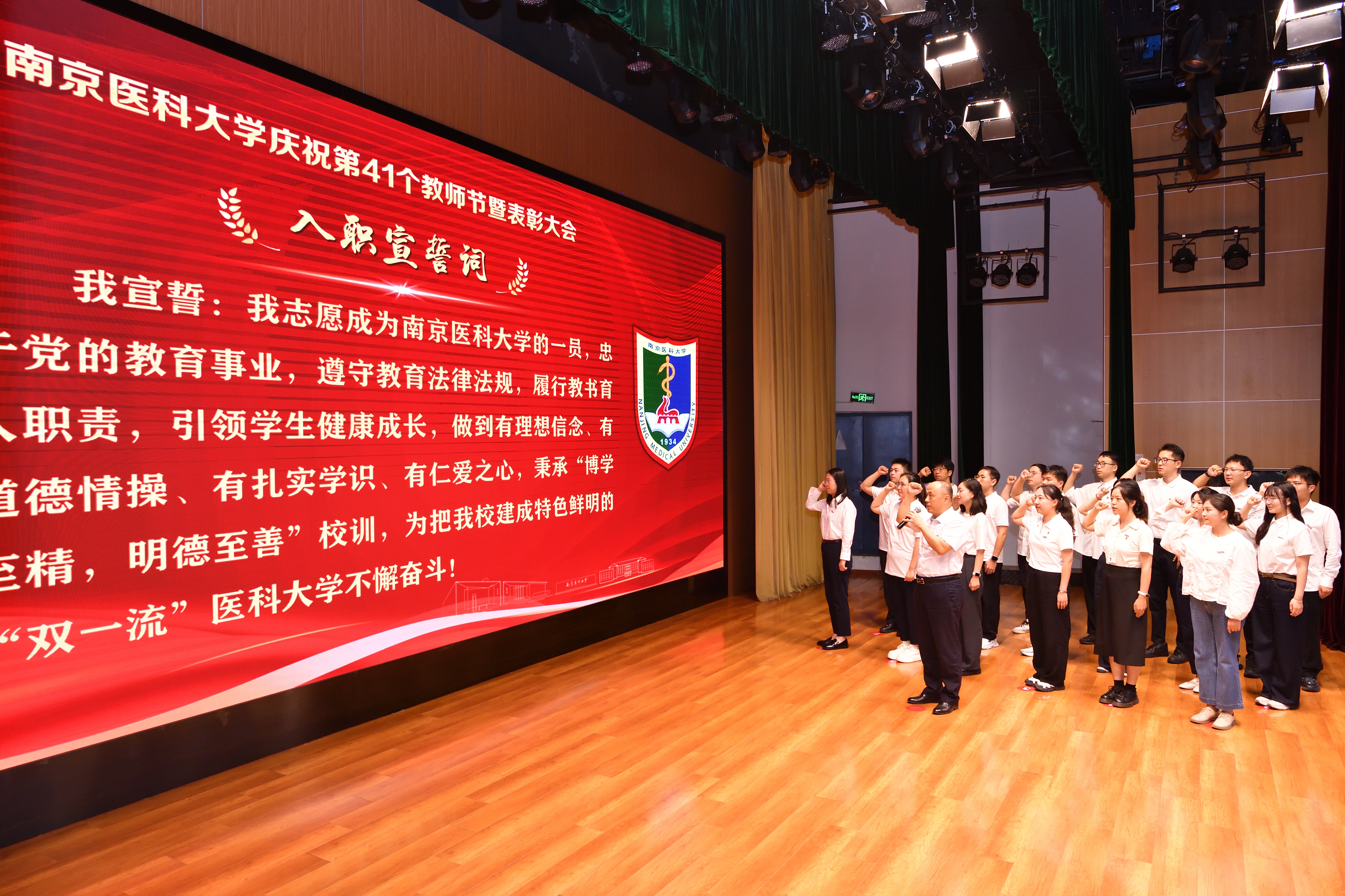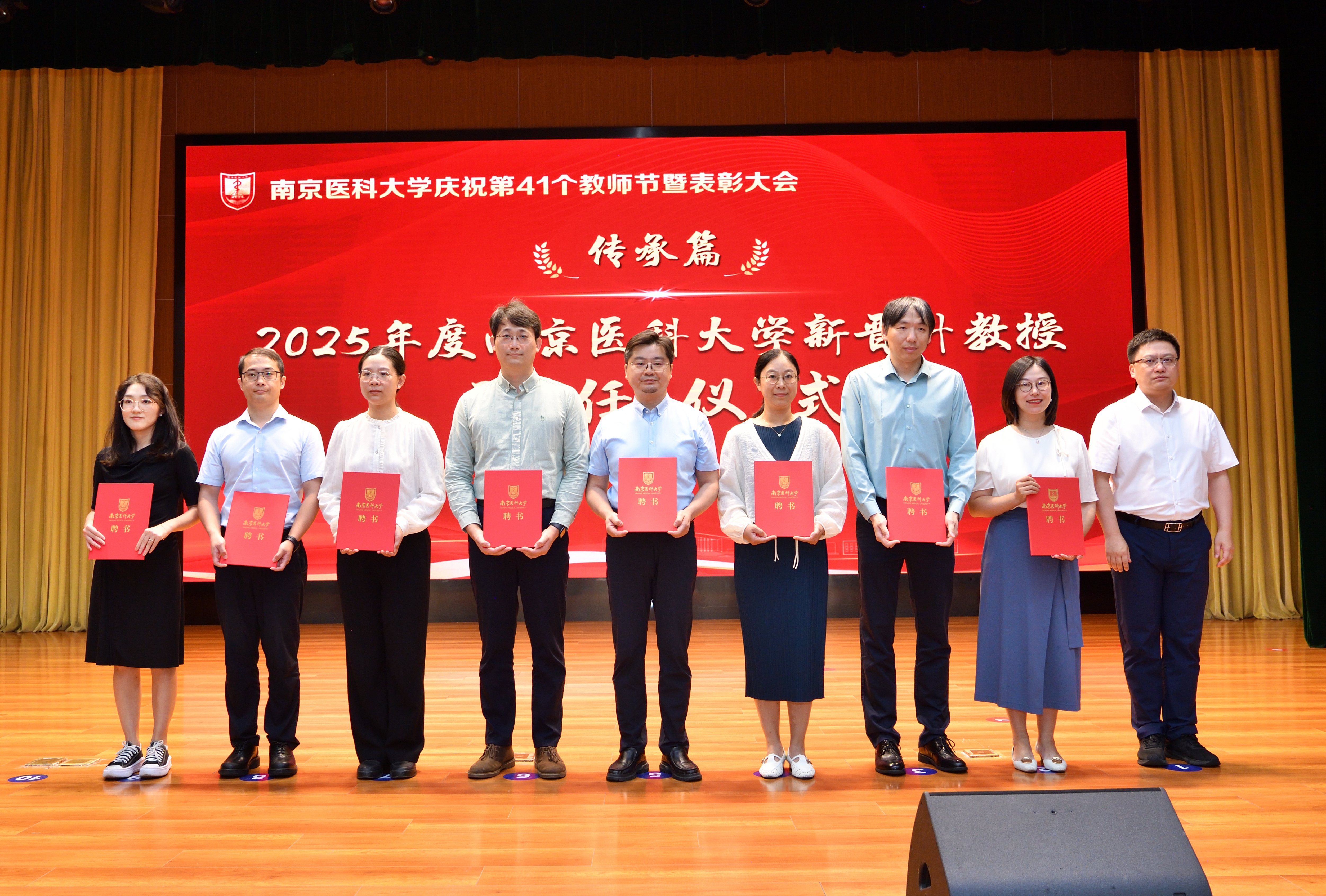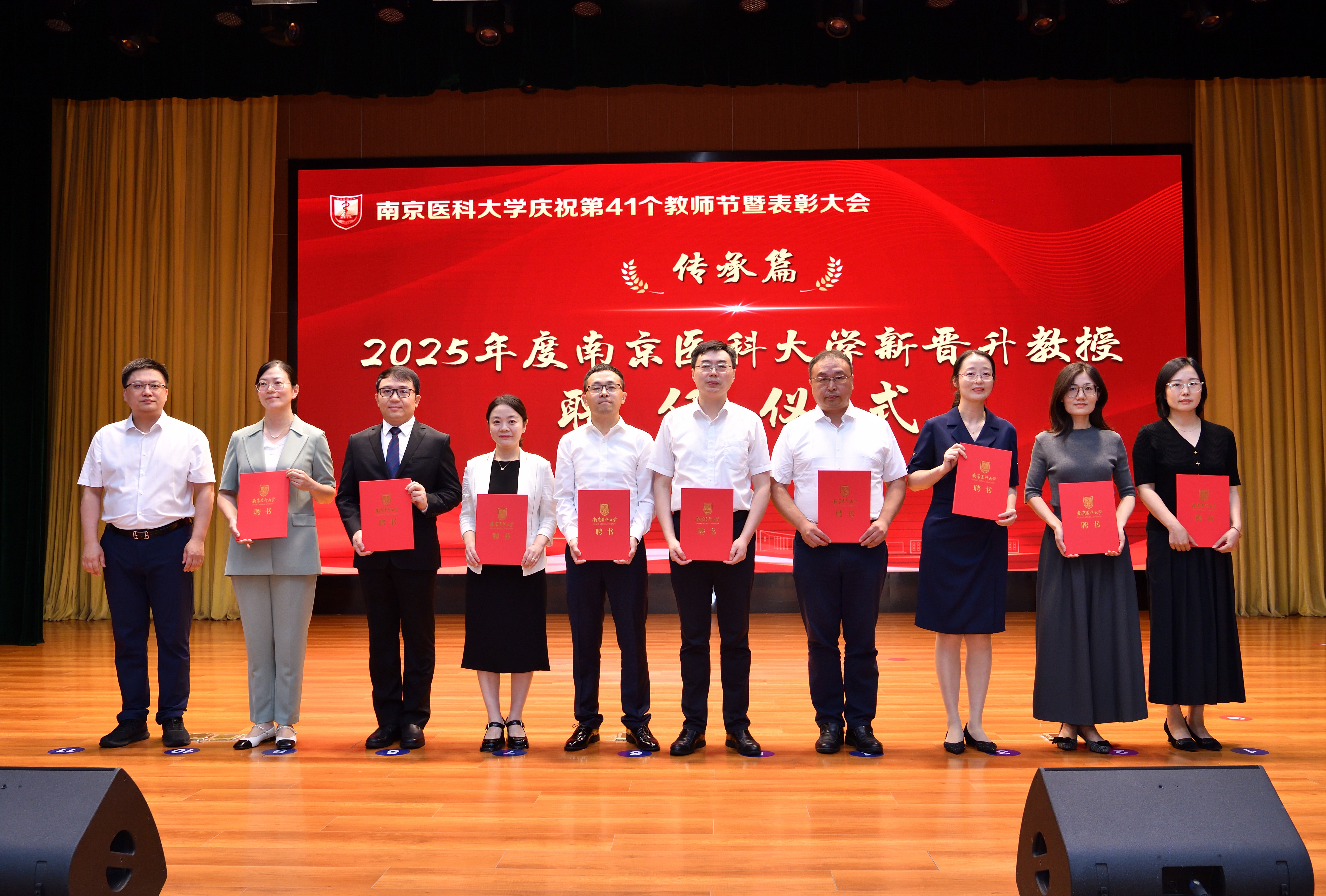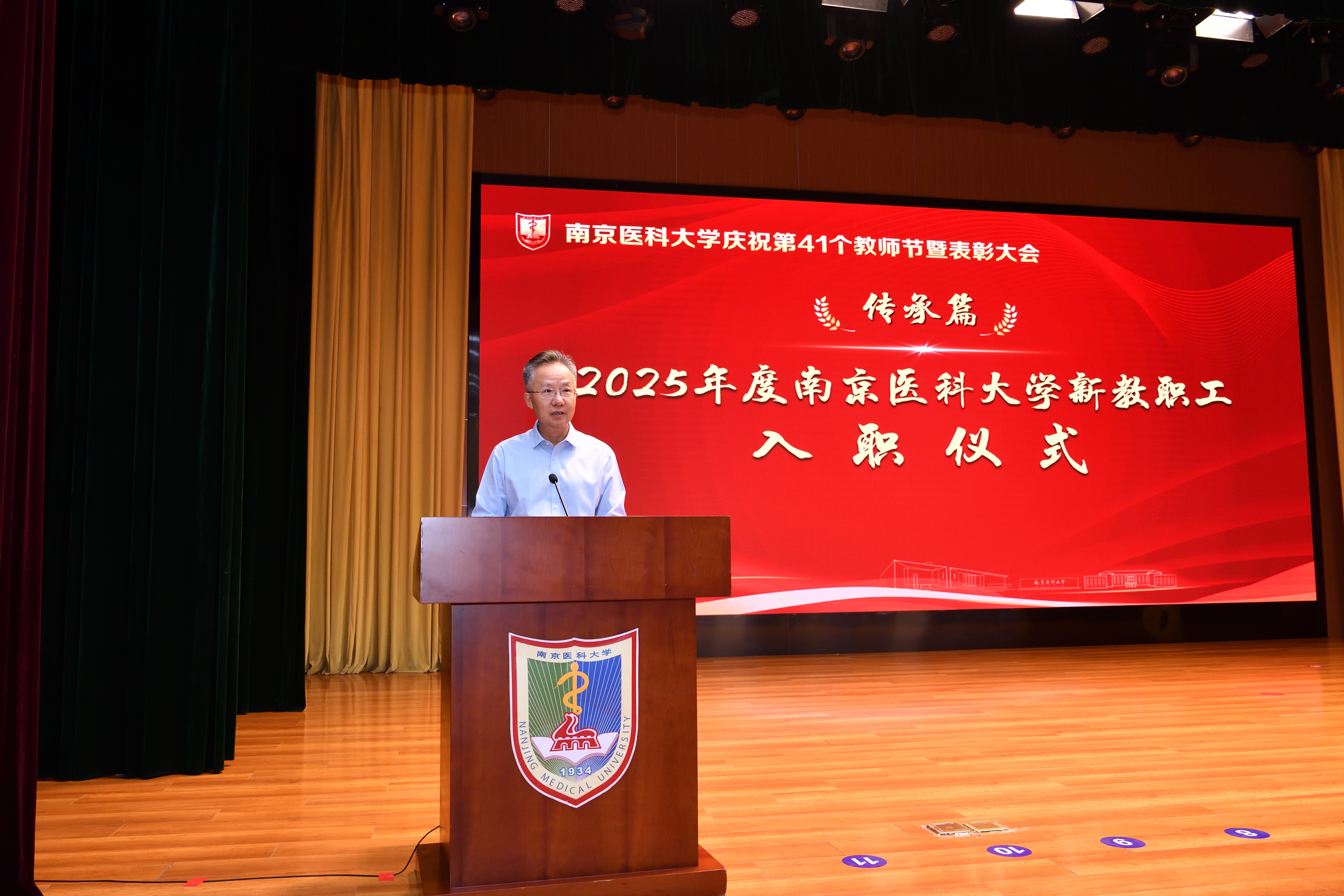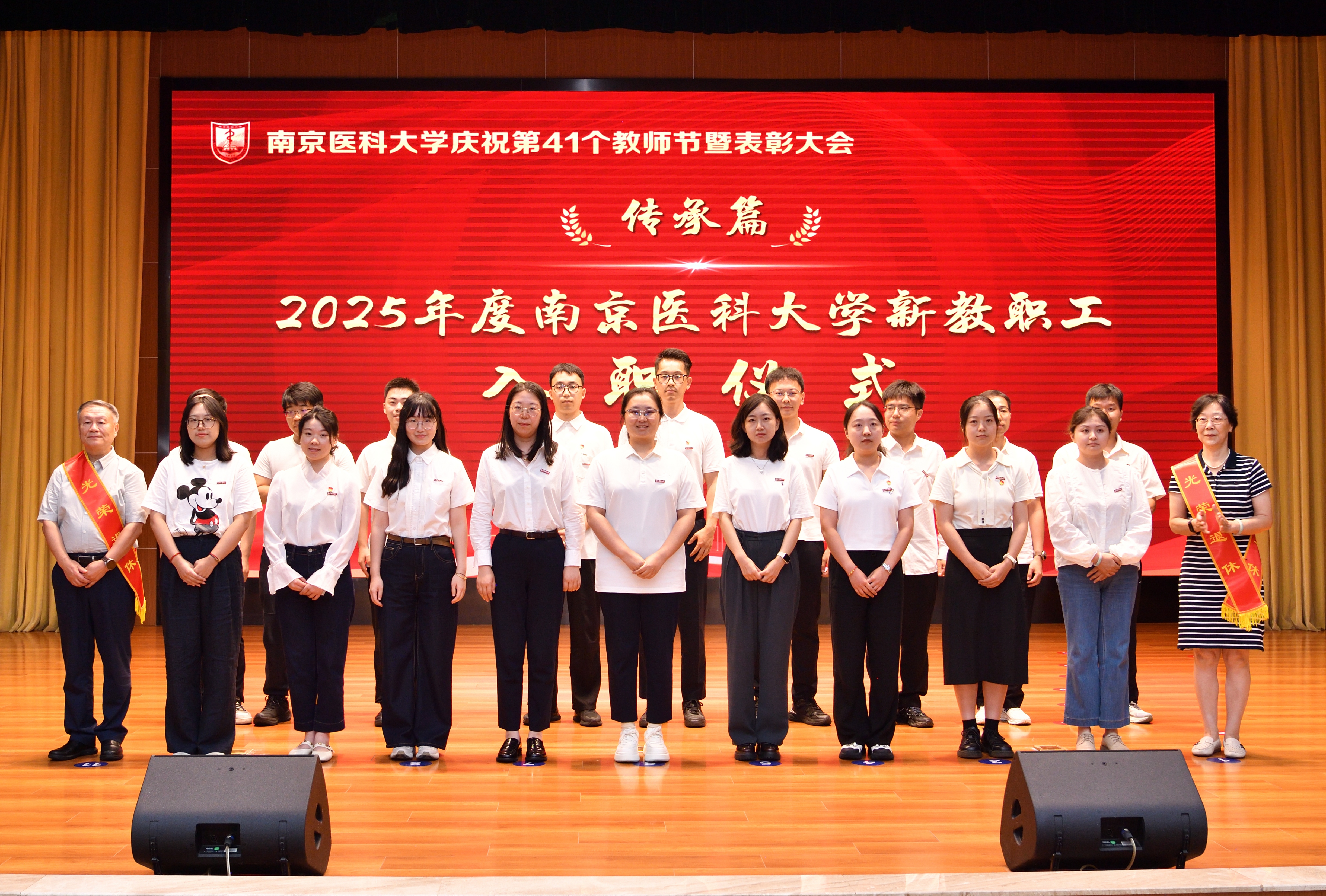 “传承篇”环节分别举办了新教职工入职仪式和新晋升教授聘任仪式。在2025年度南京医科大学新教职工入职仪式中,荣休教师代表茅力老师和施荣根老师为新教职工代表佩戴校徽。全国人大代表、江苏省教学名师、药学院韩峰教授带领全体新教职工进行入职宣誓。57名新“南医人”面向校徽许下庄严承诺,正式成为南医大家庭的一员。