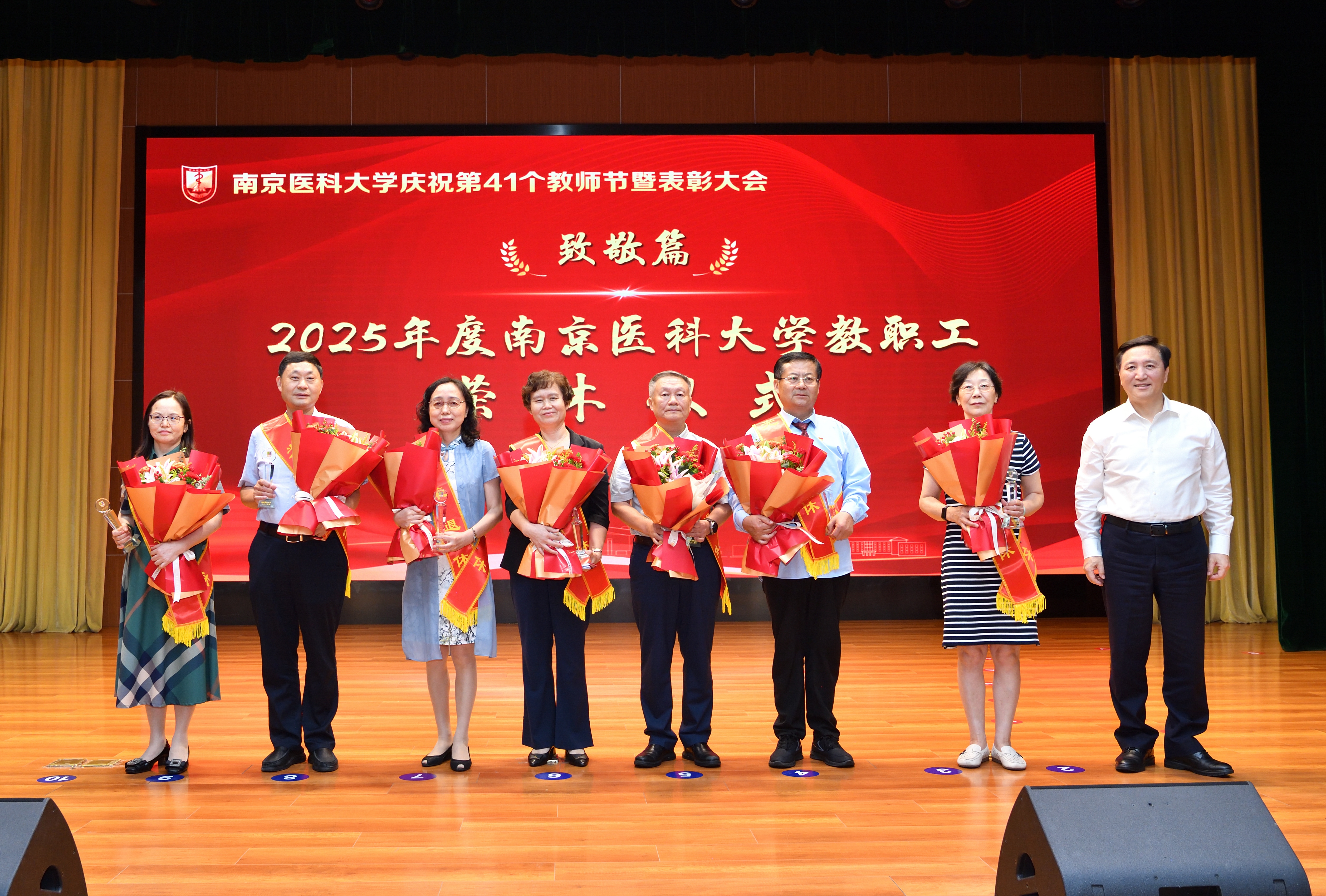 在“致敬篇”中,大会举行了2025年度南京医科大学教职工荣休仪式。荣休教师代表分别发表感言,深情回顾了自己的工作生涯,分享了与学校共同进步的点滴记忆,表达了对医学教育事业的无限热爱与不舍,对同事们的陪伴与支持深感珍惜。他们表示,退休不退志、离岗不离心,将继续关注和支持学校工作,永葆南医人的本色。兰青书记为7位荣休教职工代表颁发荣休奖杯,感谢他们数十年的无私奉献和辛勤付出。