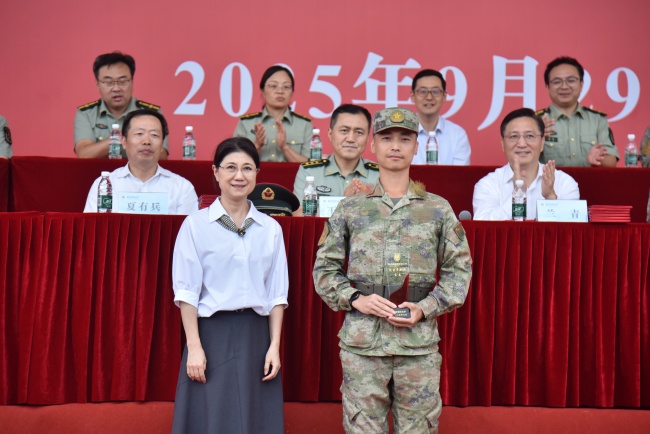 党委副书记徐珊为葛团长颁发“南京医科大学2025级新生军训工作突出贡献奖”水晶奖杯。主席台领导分批为受表彰对象代表颁奖。