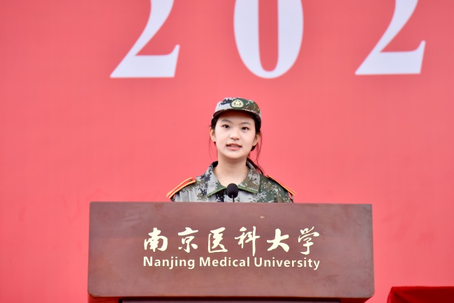 基础医学院2025级新生李雨凡代表军训新生发言,分享了军训中锤炼意志、精进救护技能的感悟与成长。