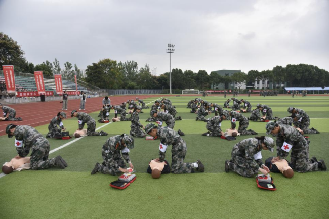 在军训成果汇报环节,参训学生进行了匕首操、格斗术、应急救护等科目,并将军事技能训练大纲要求与医学院校特色相结合,展示了模拟战场环境下的实战化救护操作,新生们熟练完成心肺复苏、创伤包扎、伤员转移等内容,凸显“守护生命、‘救’在校园”的训练成效。