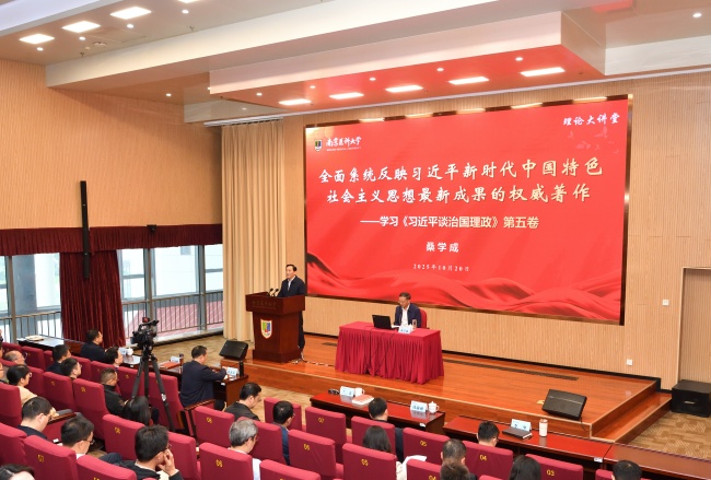 10月20日下午,我校举办理论大讲堂,围绕学好用好《习近平谈治国理政》第五卷,邀请江苏省委党校桑学成教授作专题辅导报告。校党委书记兰青主持报告会。