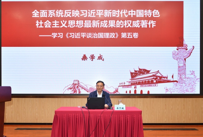 桑学成教授以《全面系统反映习近平新时代中国特色社会主义思想最新成果的权威著作》为题,结合当前国际国内形势变化、党情社情现状,从历史维度和理论高度详细解读《习近平谈治国理政》第五卷的时代背景和重要意义、主要内容和逻辑结构。他指出,《习近平谈治国理政》第五卷聚焦以中国式现代化全面推进中华民族伟大复兴的总目标,分领域阐释了在全面深化改革、实现高质量发展、推进教育科技人才事业发展等方面提出的一系列治国理政的新理念、新思想、新战略,充分体现了鲜明的人民立场、强烈的问题意识、不懈的守正创新、恢宏的战略视野和坚定的文化自信,进一步全面深刻地回答了中国之问、世界之问、人民之问和时代之问,体现了中国共产党作为一个百年大党和世界上最大的马克思主义执政党的忧患意识和政治清醒。