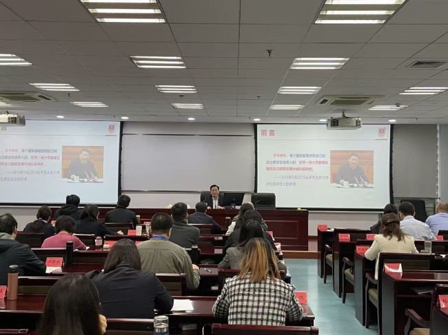 兰青书记从“大学与社会”“南医的实践”“思考与建议”等三个方面,进行了深入解读。理论层面分别从大学的初心和使命、新中国成立后大学使命演进、大学和社会的关系、正确理解几对关系等四个维度分析,总结“大学的初心就是服务社会”“大学的使命是推动社会发展”等结论。实践层面以时间线为轴,在校史变迁、创新创造、历史特点和新的实践等方面,全方位展示了我校在服务社会实践中做出的成绩与贡献,充分展现了作为一所国家“双一流”建设高校,始终聚焦一流学科、一流附属医院和一流办学条件,凝心聚力、统筹施策、开拓创新、改革攻坚的坚定决心。
