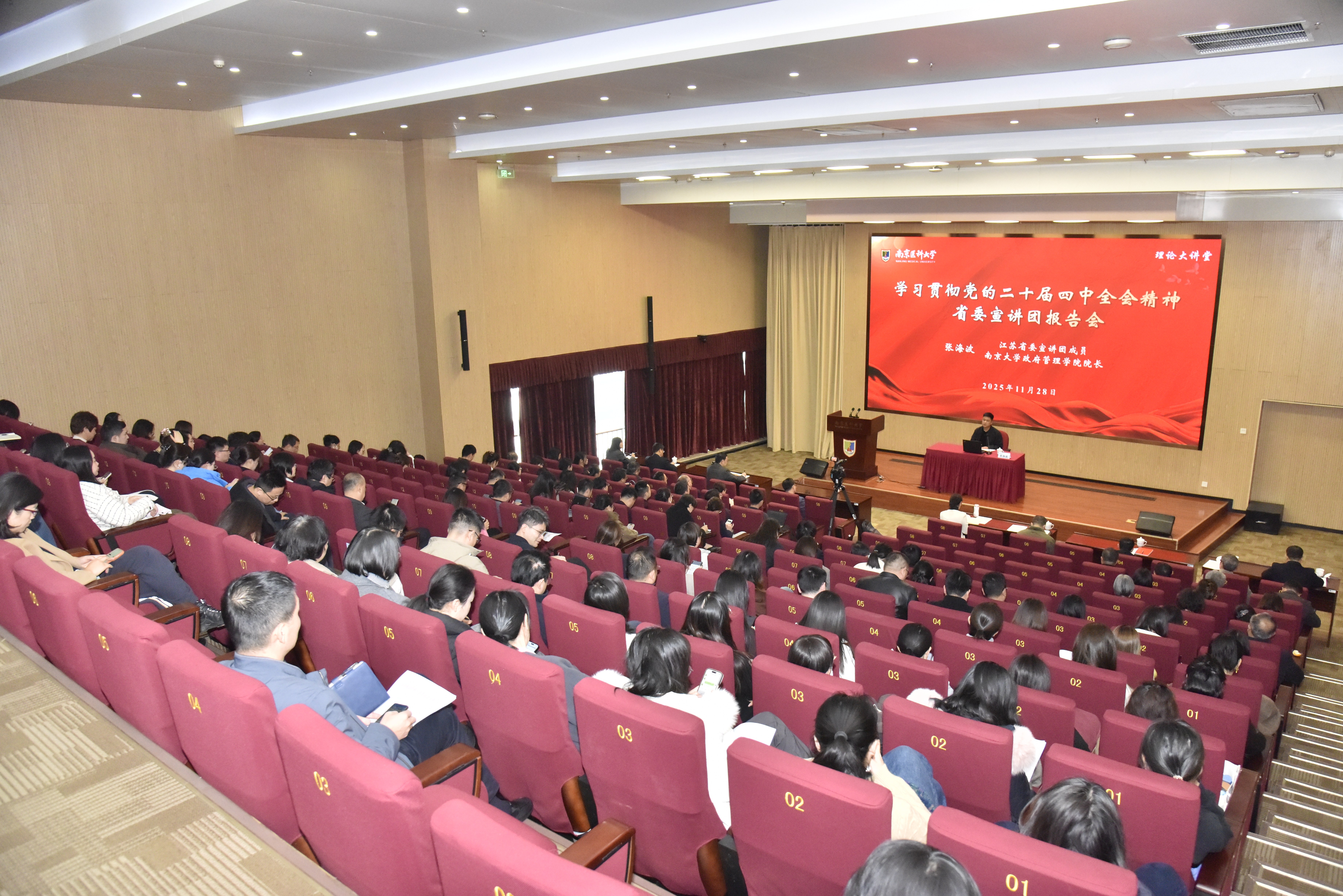 11月28日,学习宣传贯彻党的二十届四中全会精神省委宣讲团报告会在我校举行。省委宣讲团成员,南京大学政府管理学院院长张海波作报告。校党委副书记徐珊主持报告会。